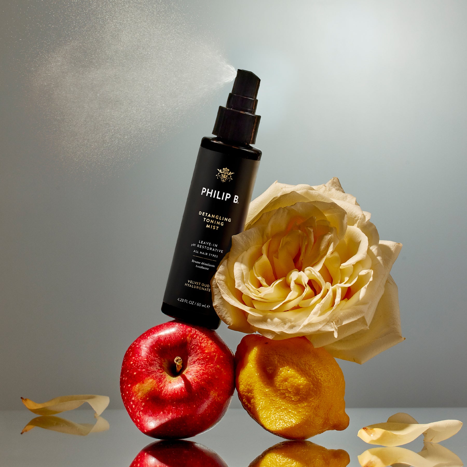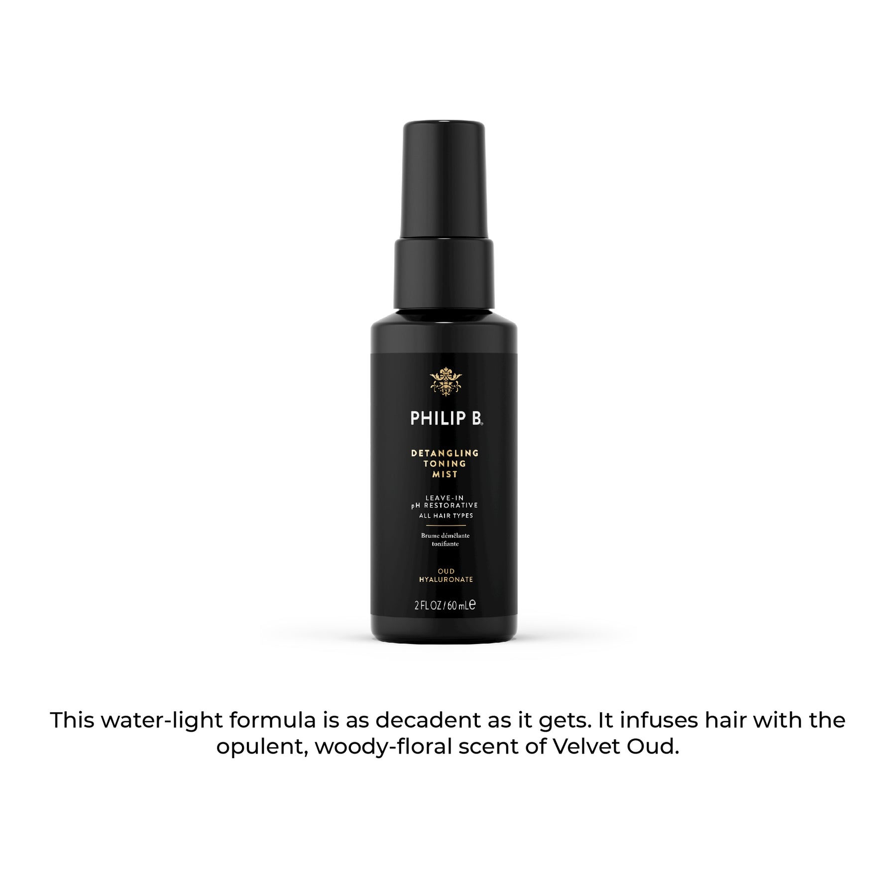 Water-light leave-in toner with the sexy, woody-floral scent of Velvet Oud – an opulent alternative to our classic Detangling Toning Mist.